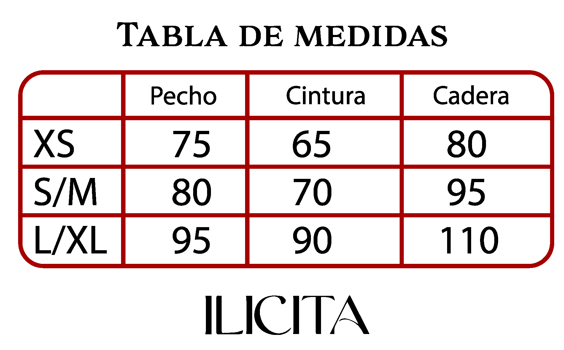 Tela muy elasticada, la medida que sale en la tabla es sin estirar, la tela da hasta 15cm más. Para que se realice el efecto visual del diseño te recomendamos guiarte con la medida de tu cintura y esa restarle 5cm. La medida que te dé será tu talla en nuestra marca